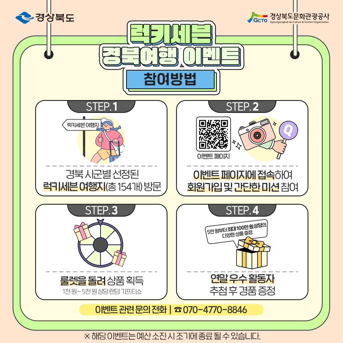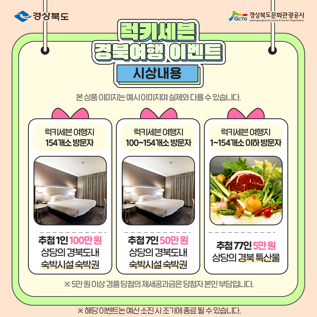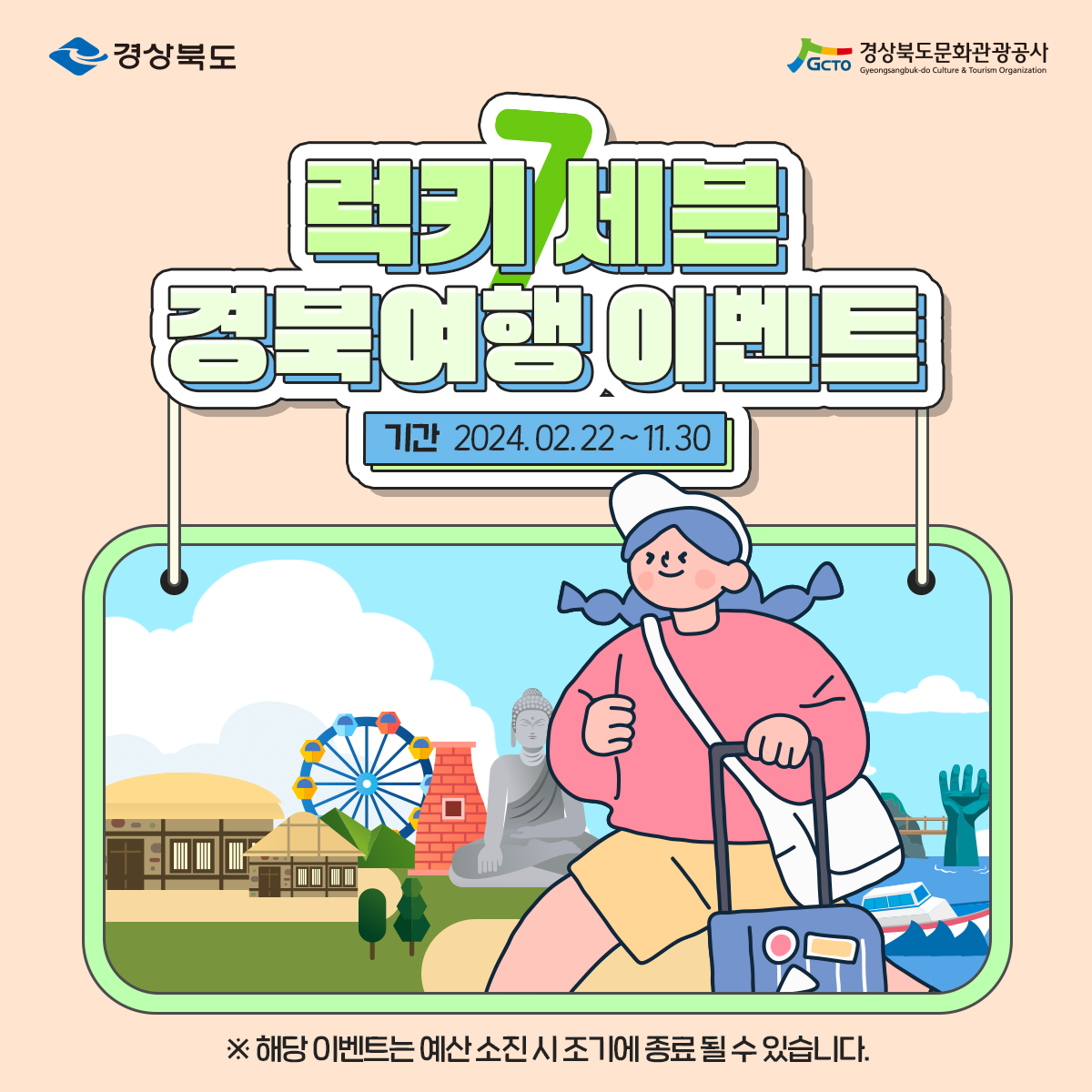 -럭키세븐 여행지 101~154개소 방문자 7명 추첨 50만원 상당 경북도내 숙박시설 숙박권