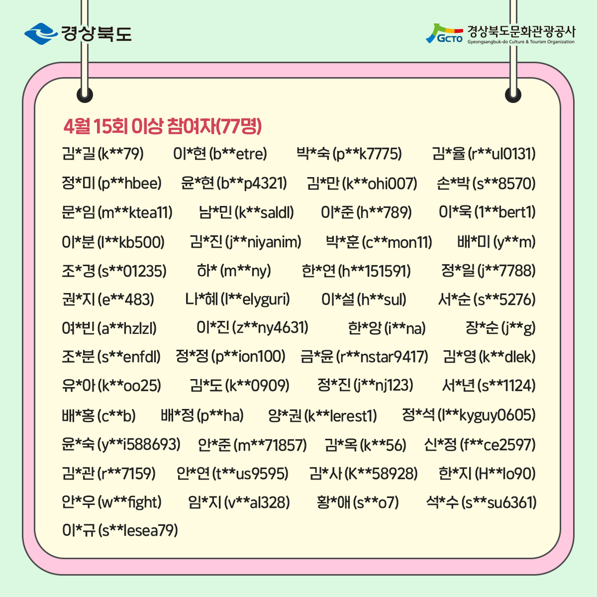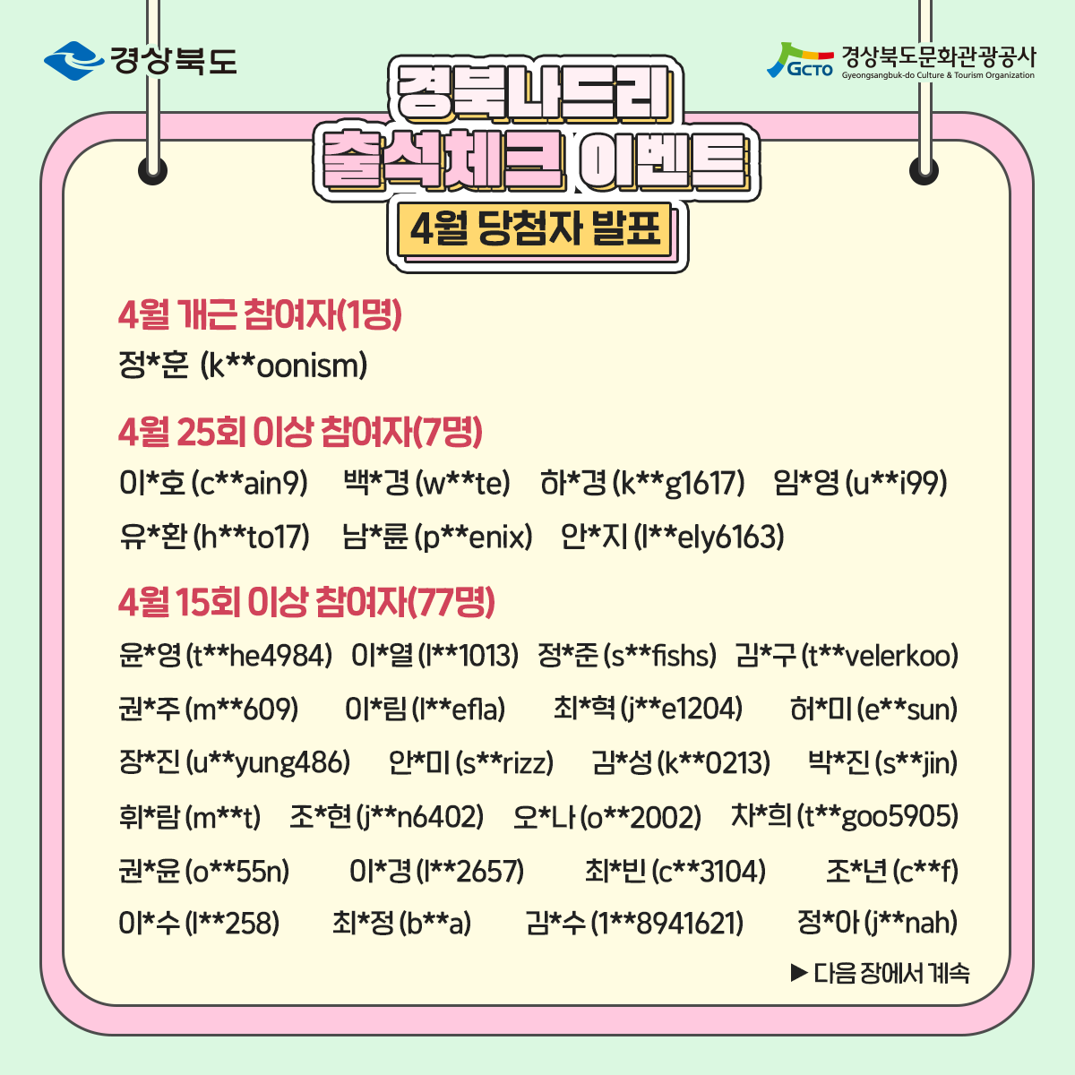 제목경북나드리 출석체크 이벤트 4월 당첨자 발표